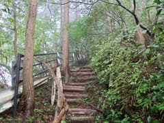 今日の装備は完全な登山用。登山靴に履き替えて出発、木の階段道を登る。すぐに車道を横断し、しばらく階段の急登が続く。気温は高くないが、霧が立ち込めて湿度が高い。なるべく汗をかかないよう、ゆっくり登る。