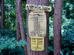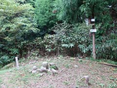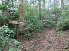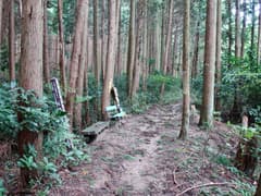 大きくジグザグを切って登ると、尾根上の平坦な踊り場の「中ノ平」に着く。ここの道標はJR北宇智駅の時刻表(2016.11現在)付きなのがユニーク。ベンチもあり、涼しい風が吹き抜ける休憩適地だ。
