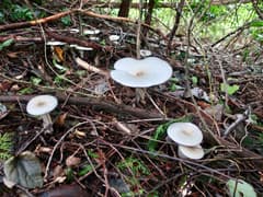 やがて傾斜が緩まり、尾根上を直線的に登る。檜林に覆われて、展望はほとんどない。林床の湿った落ち葉の間には、白いキノコがニョキニョキと大量に出ている。この秋はキノコが豊作な予感。