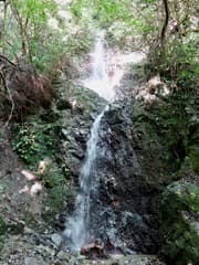 やがて「天ヶ滝 0.1km」の道標やベンチ、「金剛生駒紀泉国定公園」の標柱ある分岐に着く。右の滝への道に入ると、山腹をトラバースして緩く下り、一部藪っぽいところを抜けて渓流に降り、少し遡ると二段に落ちる天ヶ滝が現れる。水害でちょっと荒れた感があるが、落差7m×2くらいの立派な滝だ。