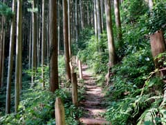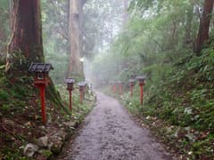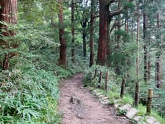 右に水越峠・大和葛城山へのダイトレを分け、一ノ鳥居を潜って緩く登る。樹齢500年の仁王杉をはじめとして杉の巨木が立ち並ぶが、太い幹がポッキリ折れたものもあり、先の台風の猛威が窺われる。