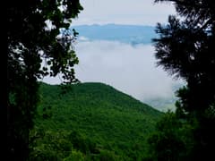 分岐に戻って尾根上を緩く登ると、左山腹をトラバースして斜め上へ登り始める。道の傾斜は緩くて楽だ。実をつけ始めたヤブミョウガが多い。檜林に覆われて相変わらず展望はないが、木の間から僅かに得られる個所があり、霧はだいぶ晴れてきたようだ。