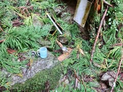 標高の上がったこの辺りから、台風襲来の際の強風で折れて落ちた緑の枝葉が登山道を覆い始める。ただし、小さい物がほとんどなので、歩く邪魔にはならない。尾根を絡んで緩く登ると新欽明水で、右下に水場がある。ここも落ちた枝葉に覆われているが、パイプからチョロチョロと流れ出す冷たい水を飲むことができた。
