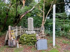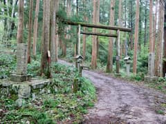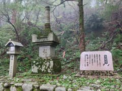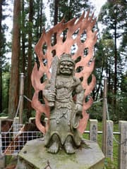 湧出岳から急な作業道を下って車道に合流。ここに出迎え不動明王の石像がある。説明板によると、湧出岳には神々が湧き出て日本全国に広まったという伝説が残るそうである。