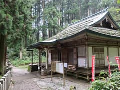 神社から参道を下り、後醍醐天皇と大塔宮を供養するために足利時代に建立されたという宝剣塔や夫婦杉の巨木を過ぎると、右手の山間に転法輪寺の本堂が建つ。