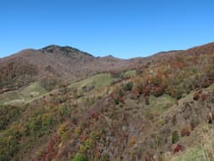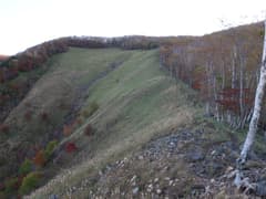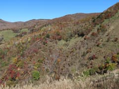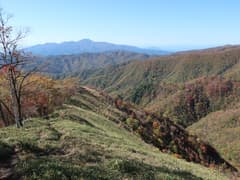 長袖シャツを着て出発。色付いた葉と枯れた葉が混じる樹林の中を登り、左斜面が伐採地跡で一面の笹原となった尾根の上に出る。眺めが開けて、ヒライデ沢の谷を隔てて前袈裟丸山を仰ぐ。上空は雲一つない青空が広がって、予報通りの快晴だ。谷間は紅葉しているが、まだ山陰で日が当たらないので、色が映えない。紅葉の鑑賞は帰りに期待しよう。