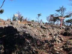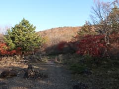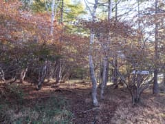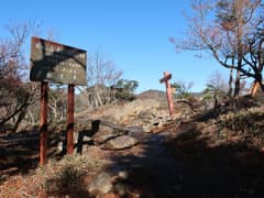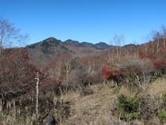 塔ノ沢登山口からの登山道を合わせ、広くなだらかな稜線を辿る。この辺りの紅葉は、所々にハッとする鮮やかな赤があるものの、既に終盤で、色付かずに枯れてしまった葉も多いようだ。地面には薄く霜が降りて、秋の深まりと冬の近づきが感じられる。