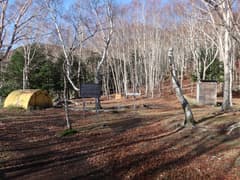 小丸山から少し下った鞍部の広場に避難小屋(カマボコ型のシェルター)とWCがある。避難小屋の中を覗くと綺麗にしていて十分使えるが、ちょっと狭くて湿気が高い。この広場には、大昔に袈裟丸山を単独で縦走した際に、テントで泊まったことがある。夜になると鹿がテントの周りをケンケンと鳴きながらうろついていたことが記憶に残っている。
