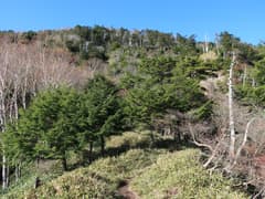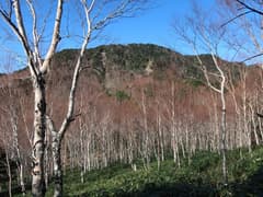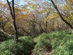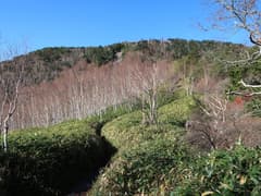 避難小屋から軽く登って小ピークを巻くと、岳樺林越しに前袈裟丸山を間近に仰ぐ。笹原の切り開き道を進んで、頂上への最後の急坂に取り付く。この辺りは自然林が綺麗なところだ。途中、木の根、岩角、トラロープを摑んでの登りとなるが、そう長くはなく、程なくなだらかで笹原に覆われた稜線上に登り着く。左手に赤城山を望み、振り返れば関東平野が一望できる。