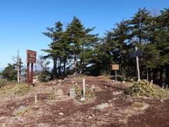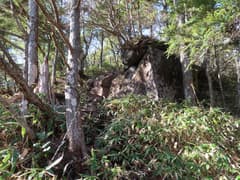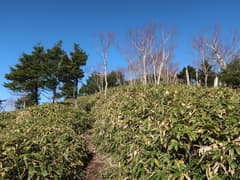 ゆるゆると笹原を登って、前袈裟丸山の頂上に着く。入れ替わりに単独行のおじさんが下山し、私は今日の登頂の二番手となったようだ。頂上は開けた平地だが、樹林に囲まれて、意外と展望がない。ザックを置き、後袈裟丸山の方へ向かう。入口には「注意 前袈裟丸山から後袈裟丸山の間・八反張は風化が激しく危険ですので通行を禁止します 東村」との看板がかかる。前回も通行禁止の看板があったが、実際にはあっさり通過できた。今はどうなんだろう。
