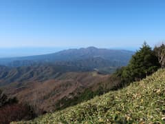 下山は往路をそのまま戻る。関東平野を俯瞰しながら、なだらかな笹原を下る。関東平野の前に低く横たわる山塊の中には(写真では分かりにくいが)鳴神山や吾妻山を見いだすことができる。写真を撮っている間にハイカーさん数人が登って行く。急坂に入って急降下すると、再びなだらかな稜線の歩きとなる。さらにハイカーさん数人と交差する。