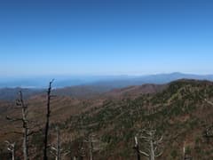 眺めを満喫していると、後続のハイカーさん3人組が到着。やはり、山岳展望に感嘆の声が上がる。彼らはここで昼食にするようだ。私は頂上に戻り、お湯を沸かしてコーヒーを入れ、小さなクリームパンを腹に入れる。まだ昼には早いし、今日は午前中に下って、温泉に入った後に昼食にするつもりなので、ここでは軽く食べるだけにしておく。