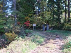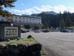 小さな沢に沿って下り、沢を何度か渡り返すと、杉林からゲレンデに出る。この地点には道標がある。あとはゲレンデを下って、湯沢パークホテルまで戻る。