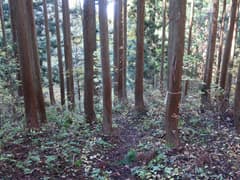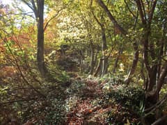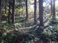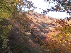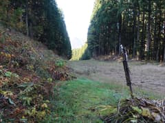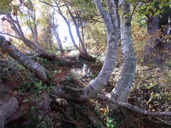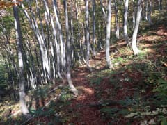 やがて尾根から右斜面に入り、ブナの美林に覆われた傾斜の緩い山腹を降りる。ブナの黄葉を透かして日差しが零れ、林内はカラッとして明るい。山道に積もる枯葉をカサカサと踏んで、斜面をジグザグに下って行く。小さな窪を渡ると杉林に入り、麓に近づいたことが感じられる。