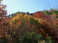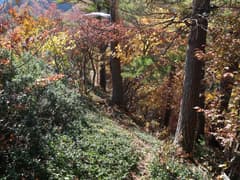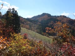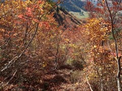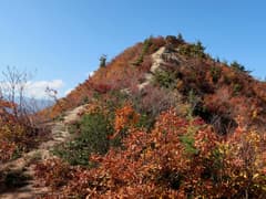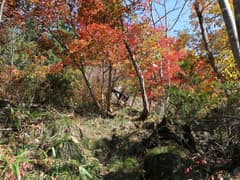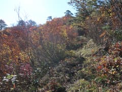 ここから登山道に入り、杉林の中を登る。道型は細いが、刈り払いされているようで明瞭。良く踏まれてもいる。杉林を抜けると色付いた樹林に覆われた尾根道となる。右側にはゲレンデを隔てて、方丈山が眺められる。