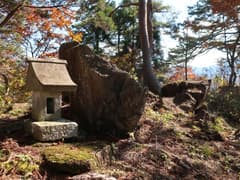 露岩の多い尾根を登ると「方丈山→」の道標があり、登山道は右折するが、すぐ先に小さな赤鳥居と石祠があるので行ってみる。これがトレッキングコースの略図にあった鎮守様だろうか。石祠は湯沢市街を向いて建ち、その方向は樹林が切り開かれて眺めが良い。