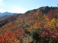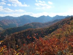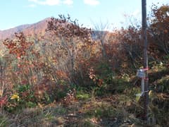 ゲレンデの反対側も眺めが開け、麓にスキー場跡(後日調べると、2011年に閉鎖された加山キャプテンコーストスキー場)のある紅葉した山並みが見える。この辺りの山は標高1300m程の無名の山だが、豪雪地帯の山らしい峻険な山肌を見せて、興味を惹かれる。そこから右へ山並みを辿ると、大源太山の鋭鋒が一際大きく聳える。また、方丈山の頂上部も眺められる。なかなかいい色合いだ。
