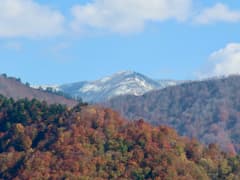 さらに小さなアップダウンのある尾根道が続く。紅葉とブナの黄葉がちょうどピークを迎えている。左手の山並みの奥には薄っすらと白くなった上越国境稜線のなだらかなピークが見える。地形図を見ると柄沢山(1900m)のようだ。