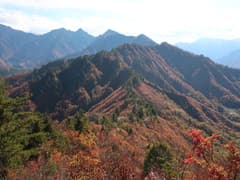 白ザレの尾根の右側はザレて切れ落ちた斜面なので、スリップしないように。左側には湯沢中里スキー場を見下ろし、山腹の紅葉が素晴らしい。背景の山は霞んでいるが、タカマタギや日白山あたりかな。その右手前には、これも尖った低山で目を引く正面山が見える。振り返れば登ってきた尾根を俯瞰。背景の紅葉の山並みを一望する。