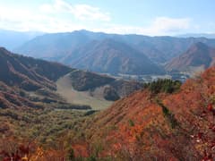 再び眺めが開け、中腹の見事な紅葉と山麓を眺めながら下る。
