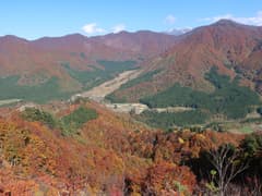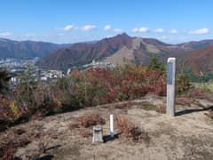 ゲレンデから道標に従って再び山道に入る。すぐに596m三角点の標石を通過。綺麗に刈り払いされた尾根道が続く。左側は紅葉した低木の斜面で、尾根上も明るく開けたところが多く、大源太川上流の旭原の集落や、奥に聳える大源太山が眺められる。