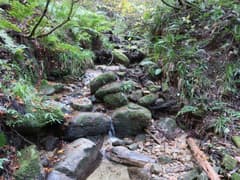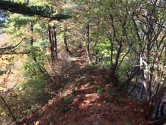 頂上に近づくと傾斜が増して、トラロープが張られた急坂も現れる。樹林の梢越しに頂上を仰ぐ。結構高く見えるが、あと10数分の距離だろう。右側は急傾斜となって谷に落ち、木の間に頂上直下のスラブを垣間見る。とは言え、歩いていて危なく感じる所はない。