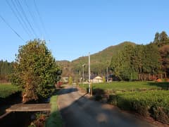 昼食後、電波塔に戻って、管理道路を下る。下り始めは、次に登る八瓶山が良く眺められる。管理道路の入口にはゲートがあり、一般車は侵入できない。田んぼが長閑に広がる谷間を少し下って右折。八瓶山の頂上を眺めながら、徳蔵方面への車道を歩く。