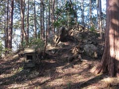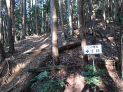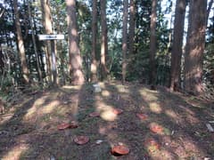 雑木林からヒノキ林に入ると傾斜が緩み、程なく石祠のある小平地に着く。八瓶山の頂上はそのすぐ後ろだ。登りをちょっと頑張ったので、登山口から20分で頂上に着いた。