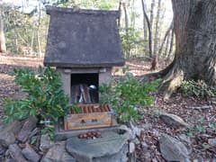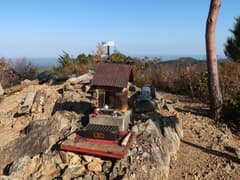 三角点から短い急坂を下り、登り返すと露岩の上に陶器製の祠の建つ鶏足山頂上に着く。丸太のベンチがあり、老夫婦のハイカーさんが休憩中。鶏足山の由来を書いた説明板があり、それによると、弘法大師が山麓で護摩修行を続けていたところ、山中から鶏の鳴き声を聞き、登ってみたところ鶏冠形の大岩があったので、この山を鶏足山と名付けた、とのこと。にゃるほど。