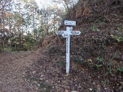 少し下ると県境稜線にも明瞭な道型が現れ、5分程進むと「←鶏足山 大沢へ下山→」の道標、さらに数分で「思案峠」の道標が設置されていて、右に大沢口へ下る道が分岐する。