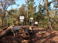 短い急坂を登って、三角点標石とベンチのあるピークに着く。樹林に囲まれているが、仏頂山や高峯が眺められる。山名標識には「三角点」と大書きされている。鶏足山の頂上はここではなく、北へ260mの地点らしい。そちらへ向かう前に、西の峰続きの焼森山を往復して訪ねてこよう。
