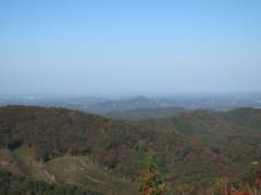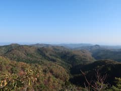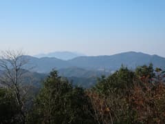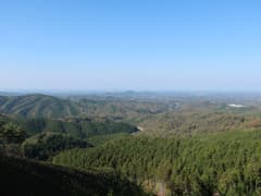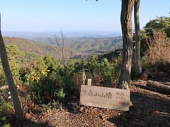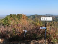頂上を囲む樹林は伐採されて疎らで、ほぼ360度の素晴らしい展望が得られる。西方には目立つピークはないが、低くなだらかな山並みが見渡す限り広がって、これはこれで特色ある眺めだ。南西から南にかけては、雨巻山、高峯、仏頂山が稜線を連ねる。いずれも低山の山並みの中にあっては、ゆったりと大きな山容がひときわ目を引く。その奥には霞んでいるが、加波山や筑波山、難台山の山影も見える。こうして眺め渡すと、見える範囲の目ぼしい山は大体登ったかな。展望を楽しんだのち、鶏足山三角点に戻る。