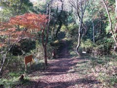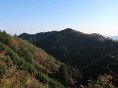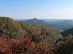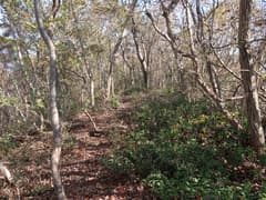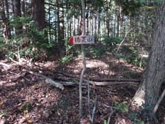 ここまでは、途中、間違い易い(実際に間違った)分岐があったものの、概ね良い登山道が続いていた。この先は道型が少し薄くなる。露岩の多い坂を登り、起伏の緩やかな稜線上の踏み跡を辿る。この辺りの稜線はヒノキと雑木が混じった林に覆われ、紅葉しているところもあるが、あまりパッとしない。これから色付くという気配でもないので、この辺りの今年の紅葉はまあこんな感じなのだろう。