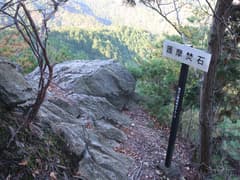 山頂から北へ県境稜線を辿る。縦走路の入口には「←大沢口へ下山 大師コース」の道標がある。急な尾根を下ると、すぐに岩棚があり、「護摩焚石」の標識が立つ。岩棚から下を覗き込むと結構な高さの断崖で、ここで護摩を焚くと高難度の修行になりそうである。