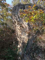 さらに県境稜線を下ると右に枝尾根が分かれ、「←並柳 鶏石↑」の道標がある。ここは弘法大師ゆかりの鶏石に立ち寄ってみよう。ぐんぐん下ると、「鶏石」の標識とともに三角形の岩がある。これだけ見るとしょぼい岩だが、もう少し下って振り返ると、結構な高さのハングした岩壁であることが判り、確かに鶏冠(とさか)と言えなくもない。