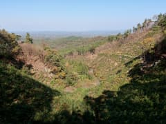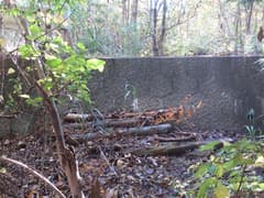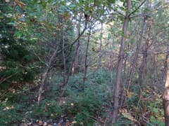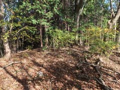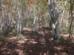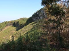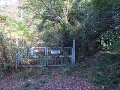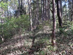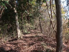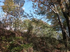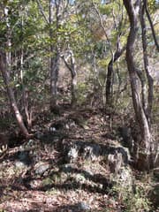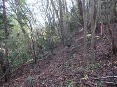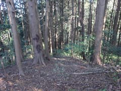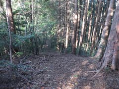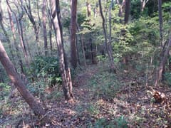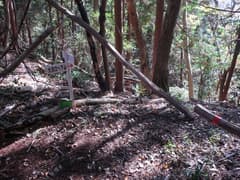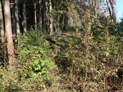 ヒノキ林の中を歩いて行くと、高い電波塔に突き当たる。頑丈な金網柵を左に回り込み、管理道路を少し下ると、ゲートに閉ざされた道路が右に分岐する。ゲートの右脇から藪っぽい林に浸入。藪に覆われた道路を横断し、若い松が繁茂した平地に出る。どうやら電波塔の跡地らしい。ここは左へ、鬱陶しい小枝藪を払いつつ進み、段差を下る。この段差は、ネット上の山行記録の写真で見た覚えがある。