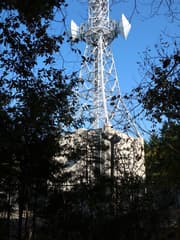 下生えにアオキが茂る植林帯をしばらく進み、ミヤコザサが現れたところで右折。尾根をゆるく登って、電波塔(docomo 花香月無線中継所)の下に出る。右側から管理道路が上がって来ていて、あとでこの道を下る。