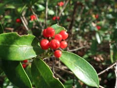 この先は藪から解放されて、雑木林の稜線上に明瞭な道型が通じている。左側が伐採された斜面となり、展望が開ける。下方には林道が通じ、ツーリング中のバイクが見える。稜線上には緑の葉と真っ赤な実をつけたツルシキミが群生して綺麗だ(ただし、有毒なので食べたりしてはダメ)。