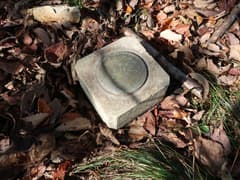 頂上には三角点標石と山名標識、円環状に埋められた八つの小さな瓶がある。これらの瓶はもちろん伝説に因んで最近埋められた新しいものだ。蓋がズレて、中に雨水が溜まっているのが見える。昔見たホラー映画の影響で、こういう瓶を覗き込むと中から何か飛び出て来そうな気がするので(^^;)、近づかない。頂上には文政年間の銘のある石碑もあり、この山が信仰の対象となっていたことが伺える。