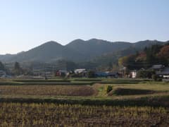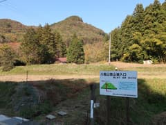 尾根を一つ越え、民家が点在する明るい谷を下って行くと、「八瓶山登山道入口」の看板があり、小さいながらもツンと尖った八瓶山が眺められる。看板には「頂上まで徒歩約40分」と書かれ、弘法大師が頂上に八つの瓶を置いて雨乞いをしたら雨が降った、とか、素戔嗚尊(すさのおのみこと)が八岐大蛇(やまたのおろち)退治に八つの酒瓶を用意した、などの八瓶山にまつわる伝説が記されている。