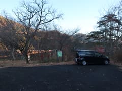 西川を長大な合瀬大橋で渡ると、橋のたもとに不動滝(人影の滝)への遊歩道の入口がある。ここに立てられた案内板の略地図によると、すぐ近くの不動尊に駐車場があるとのことなので、そちらへ。合瀬集落の最初の民家の前で左折してすぐまた左折。幅が狭い道を通って駐車場に入り、車を置く。