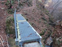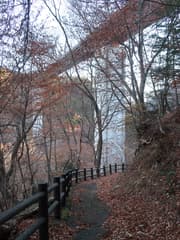滝見の後、保戸野山へ向かう。合瀬大橋のたもとから幅広い車道を緩く登り、送電線の下の切り開きの道を右に入る。送電鉄塔を過ぎて谷間の伐採地に出ると送電線巡視路の「←湯宿線87号」との標識があり、これにしたがって山道に入る。谷に向かって伐採地の脇を下り、函状の渓流を立派な鉄橋で渡る。
