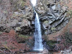 不動滝への遊歩道は、階段や手摺が整備されているが、あまり歩かれていないようで、少々荒れ気味。合瀬大橋の下を潜り、西川の河原から支流の不動沢に入ったところに不動滝が落ちる。落差は約20m。高い岩壁をV字に割った渓流が、逆層の柱状節理から飛び出して落ち、なかなか見事な滝だ。岩壁の上には不動堂の屋根が見える。