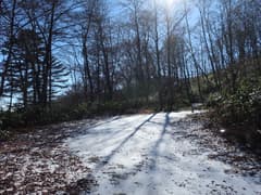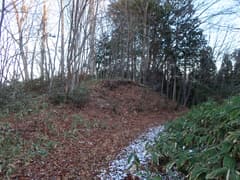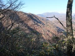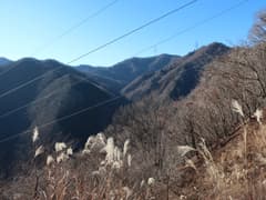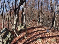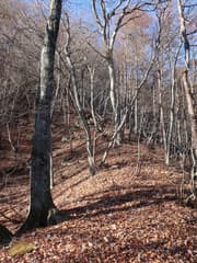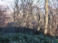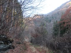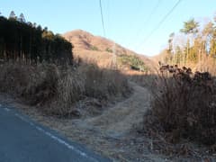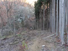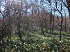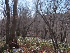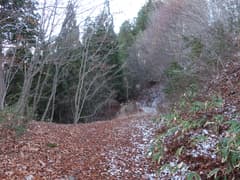 やがてナゲ藪を抜けて、冬枯れの雑木林の尾根となる。この辺りの山では、どうも標高1200〜1300mにシャクナゲの生息域があるようだ。藪のない尾根を快適に下り、傾斜が緩んで笹原に覆われた広い尾根になると、程なく林道に出る。