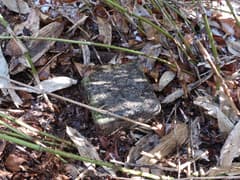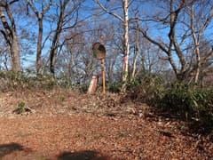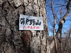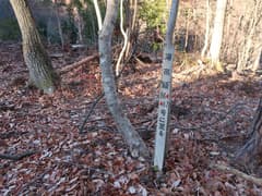 送電鉄塔から急坂をひと登りして、三角点標石と山名標識がある保戸野山頂上に着く。尾根の途中の小さな瘤で、あまり頂上という感じがしない。冬枯れの雑木林に囲まれて、展望は木の間のみ。風もなく、陽だまりに居ると、じっとしていても暖かい。少し休憩したのち、先に進む。さらにひと登りしたところが保戸野山最高点で、達筆標識がある。最高点といっても、ここも尾根の途中の瘤のような場所だ。