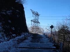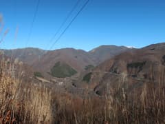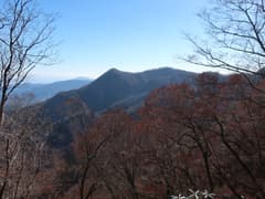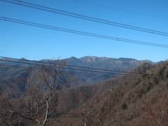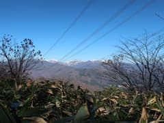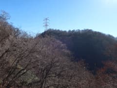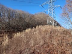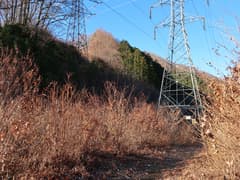 急坂を登り切った先も、雑木林の尾根の緩急のある登りが続く。やがて、送電鉄塔に到着。送電線の下の切り開きから展望が開け、左には頂上近くに紅白鉄塔が建つ大須山、右には三国峠や三国山が眺められる。
