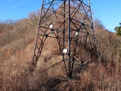 対岸の急斜面をプラ仮設階段でジグザグに登り、尾根の上に出る。2本の送電線が交差して、2基の送電鉄塔が建つ。上の送電鉄塔までは巡視路が通じている。登りで身体が温まってきたので、フリースを脱ぐ。鉄塔の基部からは、西川を隔てて唐沢山が眺められる。