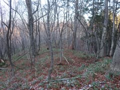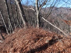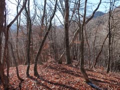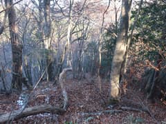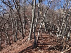 鉄塔の先は道型はないものの、冬枯れの雑木林で藪のない尾根となり、歩き易い。落ち葉を踏んで緩く尾根を登る。左に浅い凹地を見ると段々傾斜が増して、結構な急登となる。