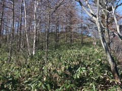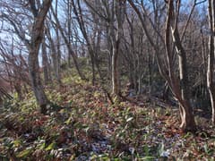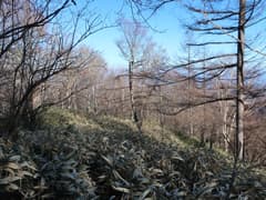 傾斜が緩み、尾根の幅が広がると、笹原を下生えとする雑木林となる。1210m標高点のある鞍部に向かって、膝程の高さの笹原をワシャワシャと搔き分けて緩く下る。