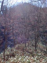 やがて傾斜が緩んで、標高1280m付近の弛みに着く。左に往路のナゲ藪の尾根を見る。少し細くなった尾根を辿ると、復路でもナゲ藪が出現。再び傾斜が増した尾根を、ナゲ藪を漕いで下る。こちらのナゲ藪は微かにけもの道が通じているので、比較的歩き易い。